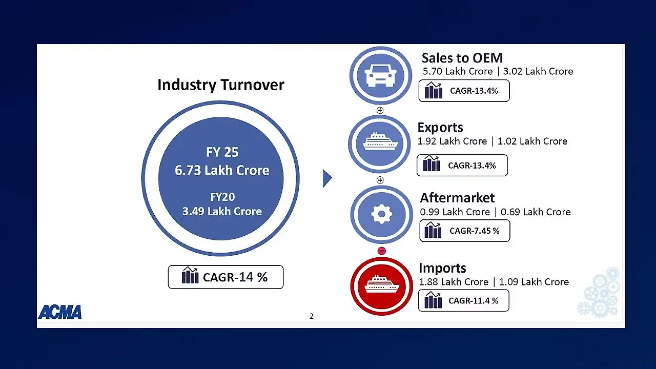 The Indian auto component industry posted a robust performance in FY2024-25, registering a turnover of INR 6.73 lakh crore ($ 80.2 billion). The sector has grown at a CAGR of 14% from FY20 to FY25, nearly doubling in value over the past five years.